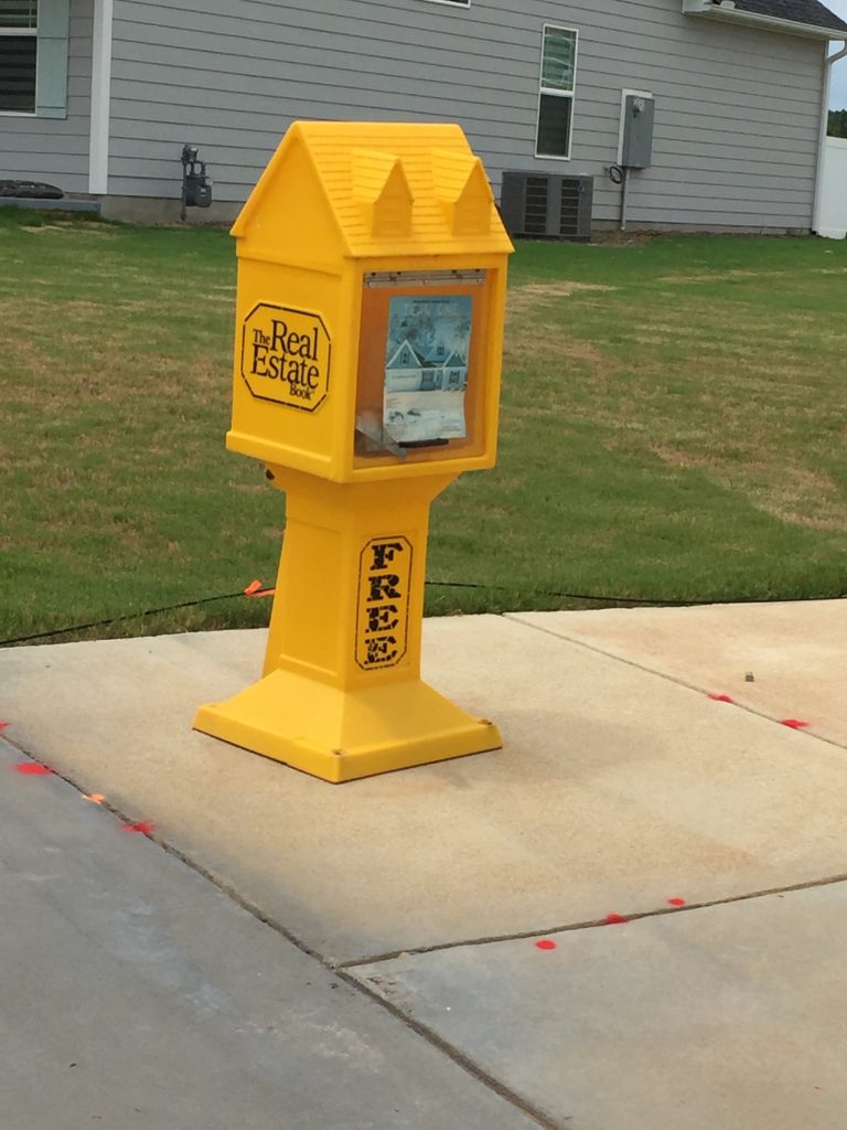 This birdhouse is sitting in the middle of a subdivision in Garner, North Carolina and has been re-appropriated to distribute a local listing of homes for sale. Who can we call to report such abuse!