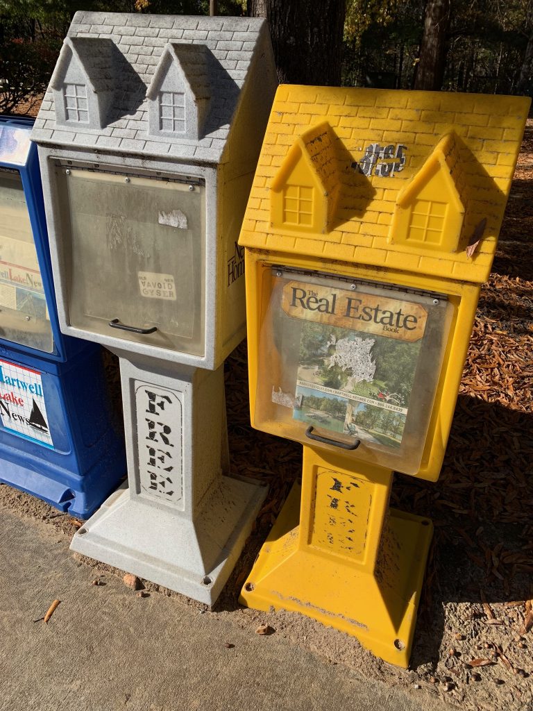 As seen at a State rest stop in South Carolina on the side of I-85 — a well weathered yellow birdhouse with a rare light green New Home Finder birdhouse. New Home Finder was a smaller sister publication of TREB.